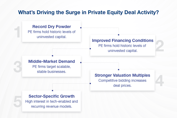 When private equity deal activity increases, business valuation trends shift upward. Sellers benefit from: